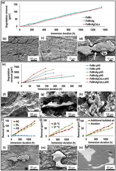 (a) Progress of degradation depending on material (N = 3, 37 °C, RL, aeration), SEM-SE: (b) FeMnAg after 700 h, (c) FeMn after 700 h, (d) FeMnAg after 1344 h; (e) progress of degradation depending on pH value (N = 3, 37 °C, aeration), SEM-SE: (f) FeMn after 192 h at pH3, (g) FeMnAg after 192 h at pH3; (h) FeMnAgCaLa after 144 h at pH3; progress of degradation of FeMnAg depending on (i) immersion solution (N = 12), (j) temperature (N = 18), (k) exchange with atmosphere (N = 18), SEM-SE after 1344 h: (l) FeMnAg (37 °C, NC, aeration), (m) FeMnAg (37 °C, RL, aeration), (n) FeMnAg (37 °C, HS, aeration).