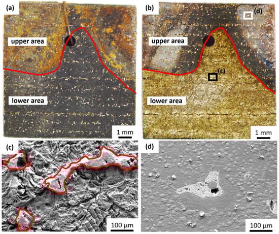 Local differences in degradation progress, FeMnAgCaLa after 1344 h (37 °C, RL, aeration): (a) image before ultrasonic cleaning; (b) image after ultrasonic cleaning; (c) SEM-SE: Magnified section of black box in (b); (d) SEM-SE: Magnified section of white box in (b).