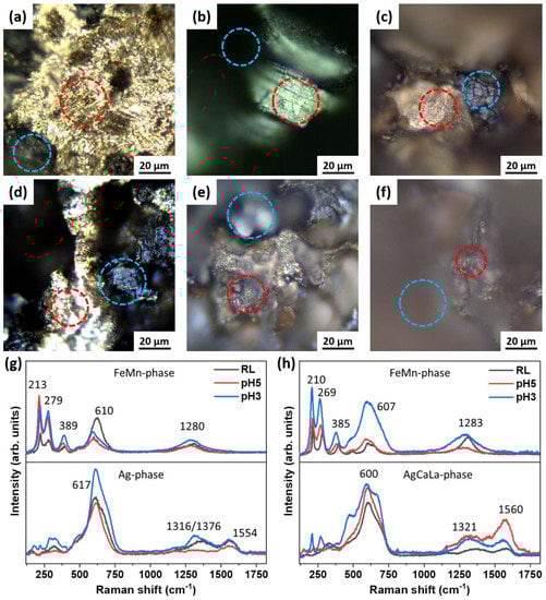 Samples after degradation (37 °C, aeration): Light microscopy image of FeMnAg: (a) 1244 h, RL, (b) 312 h, pH5, (c) 192 h, pH3; Light microscopy image of FeMnAgCaLa: (d) 1244 h, RL, (e) 240 h, pH5, (f) 144 h, pH3; (g,h) Raman spectra of the Ag and AgCaLa phase (red circles) and the FeMn phase (blue circles) at different pH values.