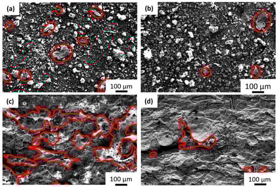 Degradation of Ag phases after 6-month immersion (37 °C, RL, aeration), SEM-SE: Particles remaining at the bottom of the immersion vessel; Ag identified via EDS and red-marked: (a) FeMnAg, (b) FeMnAgCaLa. Samples after immersion, particles marked with red border: (c) FeMnAg, (d) FeMnAgCaLa.