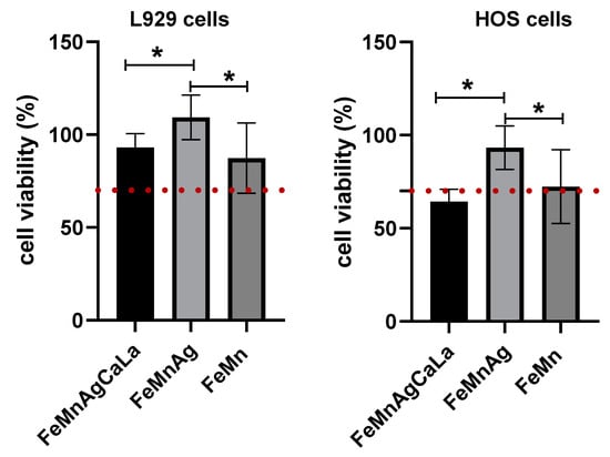 After 24 h in degradation media, the cell viability is affected in each case (Figure 7). Reduction below the threshold of 70% (DIN ISO 10993-5) is found in the HOS cells for viability in the case of FeMnAgCaLa. A similar reduction is demonstrated for FeMn samples. Significant differences can be found between FeMnAg and FeMnAgCaLa and FeMn, respectively.