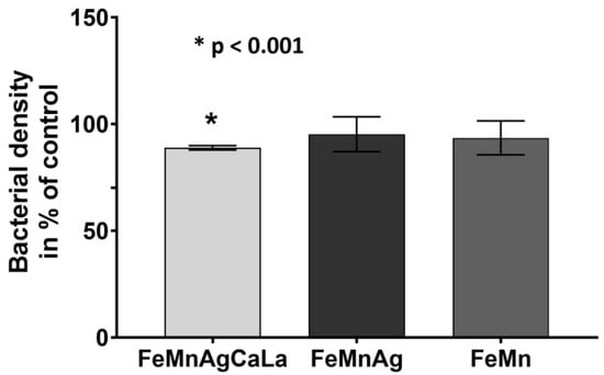 The degradation media of FeMnAgCaLa led to a significant reduction in bacterial growth compared to the reference, while FeMn and FeMnAg induced only a slight reduction in bacterial growth (Figure 8).