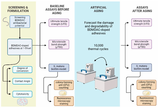 Therefore, this research aimed to develop the first dental adhesive doped with BDMDAC and study its effects on the degree of conversion, contact angle, ultimate tensile strength (UTS), microtensile bond strength (µTBS), cytotoxicity, and antibacterial and bonding performance after artificial aging. The objectives of the study were to: (1) synthesize BDMDAC-doped dental adhesive by incorporating BDMDAC in a range of 1–5 wt.% and investigate its effect on the mechanical and physicochemical properties before and after aging; (2) explore the antibacterial effect of BDMDAC-doped dental adhesive in a range of 1–5 wt.% before and after aging; (3) explore the cytotoxicity of BDMDAC-doped dental adhesive in a range of 1–5 wt.% on the studied concentrations.