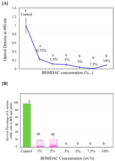 Antimicrobial potentiality of BDMDAC compound against S. mutans in planktonic cultures before being added to the dental adhesive formulation. (A) Growth curve of planktonic S. mutans subjected to contact with the BDMDAC concentrations of 0–10% (w/v). (B) Survival percentage of S.mutans viable planktonic cells growth in agar. Data are presented as the mean ± SD of three independent tests performed in triplicate. Means denoted by a different letter indicate significant differences between groups (p < 0.05).