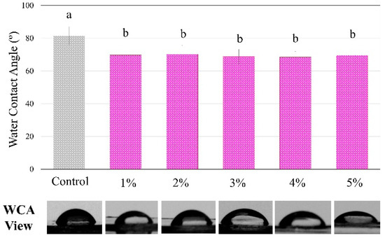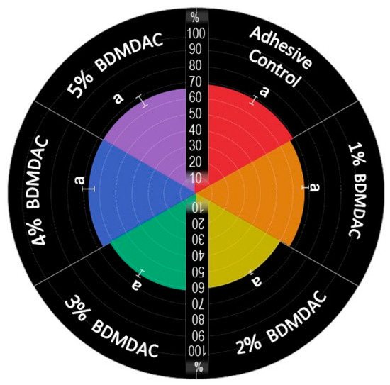Figure 4 shows the analysis of the contact angle using water drops on the polymers showed statistically significant differences among groups, with a higher angle for the control compared to all BDMDAC groups (p < 0.05). However, there were no differences from 1 to 5 wt.% of BDMDAC (p > 0.05).
