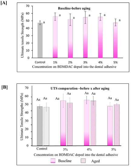 Results for ultimate tensile strength (UTS). Data are presented as the mean ± SD. (A) shows the immediate results of ultimate tensile strength for all the initial concentrated evaluated from 0 to 5 wt.%. BDMDAC. (B) shows the results for the adhesive formulations containing BDMDAC greater than 3 wt.% before and after aging. Means marked with the same lowercase letters do not differ significantly among the BDMDAC concentrations, and means marked with the same uppercase letters do not differ significantly between before and after aging; (p < 0.05).
