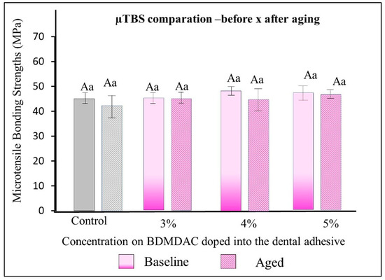 µTBS results of the dental adhesives immediately and after aging. There were no statistically significant differences among the formulated adhesives with 1 to 5 wt.% BDMDAC concentrations (comparative expressed by lowercase letters) or between before or after aging (comparative expressed by uppercase letters) (p > 0.05).