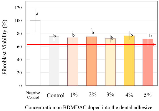 Figure 7 presents the cytotoxicity assays performed to evaluate the biosafety of the different concentrations of BDMDAC incorporated with dental adhesives. The percentage of viable fibroblast cells exposed to adhesive control (BDMDAC not added) was approximately 80%, and the cell number differed significantly from that in the negative control (no adhesive added) (p < 0.05). However, the increased concentration of BDMDAC did not promote any more significant reduction in viability. Furthermore, there was no difference in cell viability among the groups in contact with the adhesives, but the viability differed in relation to the negative control (p < 0.05).