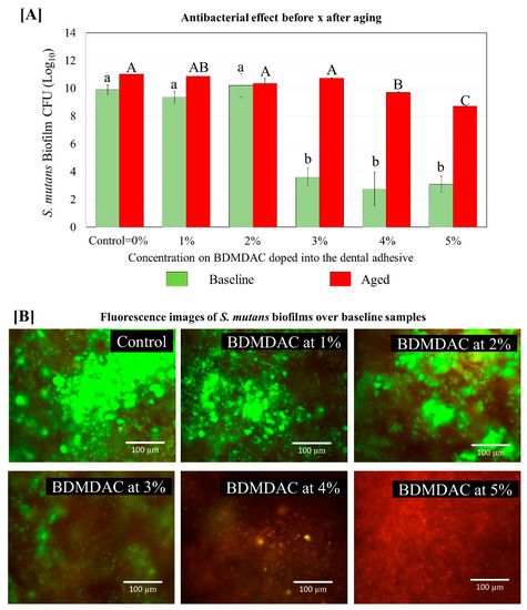 Colony-forming unit (CFU) counts for S. mutans biofilms grown over the BDMDAC-doped adhesives. (A) shows the CFU values for the biofilms grown over the samples immediately after being prepared (not subject to aging) versus the biofilm grown over the samples that were subjected to artificial aging promoted by 10,000 thermal cycles to simulate one year of service inside the mouth. Data are presented as the mean ± SD. Means marked with different lowercase letters differ significantly among the BDMDAC concentrations and means marked with different uppercase letters differ significantly between before and after aging; (p < 0.05). (B) Representative live/dead staining images of biofilms grown over baseline samples using fluorescence microscopy live bacteria were stained green, and compromised bacteria were stained red.