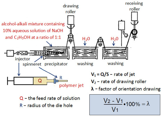 The multifilaments were prepared by coagulation method using the laboratory equipment, which is schematically shown the Figure 1 [30]. The precipitant was the ethanol-alkali mixture containing a 10% aqueous solution of NaOH and C2H5OH (1:1) [30]. The die had 100 apertures 100 µm in diameter; the solution feed rate was 0.3 mL/min, the precipitation time was 150 s, and the factor of orientation drawing (λ) was 50%. The prepared filaments were rinsed with distilled water, dried in air at 50 °C, then stapled. The stapled fiber length was equal to 70 mm. The diameter of a single fiber was 10–15 µm.