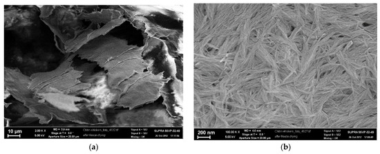 Figure 2 presents SEM microphotographs of chitin nanofibrils taken at different magnifications. The chitin particles were obtained by lyophilization of the initial aqueous suspension. As a result, a powder was obtained consisting of chitin microparticles with a width of about 30 μm and a thickness of 0.1 μm (Figure 2a), which, at higher magnification, turned out to consist of chitin nanofibrils with a width of ~20 nm and a length in the range from 600 to 800 nm (Figure 2b).