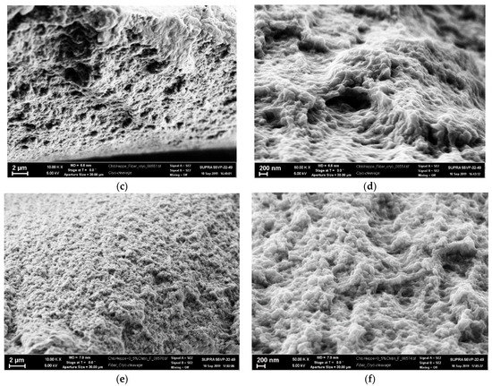 Figure 2 also shows microphotographs of the chitosan fiber (Figure 2c,d) and the composite fiber (Figure 2e,f) containing 0.5 wt.% chitin nanofibrils. As can be seen in Figure 2e,f, the composite fibers have a denser homogeneous structure compared to the unfilled chitosan fiber (Figure 2c,d), which is probably due to the good compatibility of the chitin nanofibrils and chitosan macromolecules due to the similarity of their chemical structure, that was explored in detail earlier elsewhere [28,31,32]. Chitin nanofibrils introduced into the chitosan solution facilitate the appearance of a new spatial arrangement of the chitosan chains. In the acidified aqueous solution, protonated chitosan chains preferably interact with functional groups located on the surface of rigid chitin nanofibrils and not with each other [28]. Our previous paper [33] presents a calculation performed by the molecular dynamics method. The calculation showed that the arrangement of chitosan macromolecules along an anisometric chitin nanoparticle is the most energetically favorable.