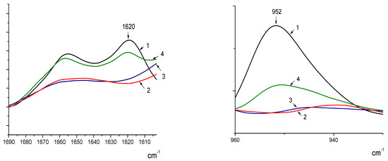 FTIR spectra of chitin (1), chitosan (2) and chitosan-based fibers containing of 0.5% (3), 30% (4) nanofibrils, respectively. The arrows mark the characteristic chitin bands: 1620 cm−1 (C=N vibration) and 952 cm−1 (valence vibrations of glucoside ring).
