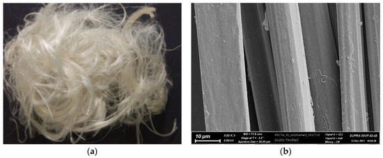 Digital image of stapled composite fibers (a) and SEM image of the multifilaments (filaments diameter: 10–15 µm) (b).