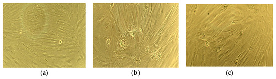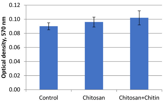 The conditioned medium after incubation of chitosan-based fibers, as well as composite fibers based on chitosan and chitin nanofibrils, practically does not change the morphology of human skin fibroblasts compared to the control sample cells cultivated under standard conditions (Figure 5). After 3 days of cultivation, the cells formed a monolayer in all three variants. The cells have an elongated fusiform shape characteristic of fibroblasts. The data of the MTT test demonstrated the absence of a toxic effect of the conditioned medium on cell viability (Figure 6), which is confirmed by the data of other authors on the absence of a negative effect of chitosan on cell viability [34].