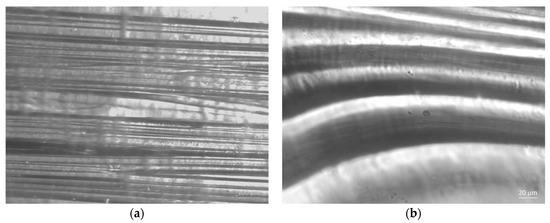Figure 5 shows optical images of the swelling of composite fibers in a buffer solution with pH = 5.8. The optical photographs (Figure 7b) show fiber-like oriented structural elements, which apparently are the fibers swollen in the buffer solution. This assumption is based on the fact that weak acids, including lactic acid, are good solvents for chitosan. Due to the presence of sodium lactate in the buffer solution the fibers do not dissolve completely. In addition, the integrity of fibers is maintained owing to the presence of chitin nanofibrils (which dissolve only in aprotic solvents) in the composite.