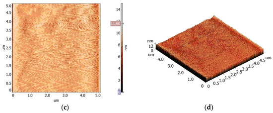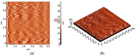 The oriented elongated structures can be seen in all images. According to the AFM data, the maximum ten-point height difference RZ for the surface of chitosan film is equal to 9.2 ± 2.2 nm; for the composite film, this value is equal to 27.9 ± 4.9 nm. This increase in surface roughness is possibly related to the presence of chitin nanofibrils in the composite fibers.
