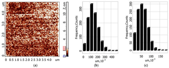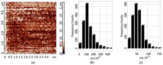 The data processing software in the Grain section was used to process the AFM images of the surfaces of the studied samples in the Gradient Image mode, and histograms of length and width distributions for the structural elements of the studied surface were obtained (Figure 9 and Figure 10).