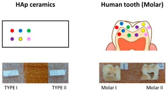 In this study, two HAp ceramics and two human teeth (sound-erupted molar teeth) were used for laser irradiation. The HAp ceramics had a nonstoichiometric structure Ca10−x(HPO4)x(PO4)6−x (OH)2−x [], and were different in initial composition (i.e., the value of the content of HPO4, x, denoted as TYPE I and II). The tooth samples were cut into two pieces and laser irradiation was performed on the enamel region of the cross-section. All subjects gave their informed consent for inclusion before they participated in the study. The study was conducted per the Declaration of Helsinki, and the protocol was approved by the Ethics Committee of the Department of Dentistry at University Hospital, Kyoto Prefectural University of Medicine or Kyoto Prefectural Rehabilitation Hospital For Mentally and Physically Disabled (project identification code: ERB-C-136, RBMR17 and RBMR19).