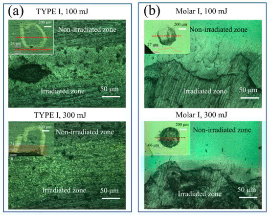 Laser microscopic images of the irradiated surfaces of (a) HAp ceramic and (b) human tooth after laser irradiation with powers of 100 and 300 mJ. The insets show respective irradiated areas using a 10× lens (irradiated zones were marked within white circles for HAp ceramic), and the profilometric changes along selected lines.