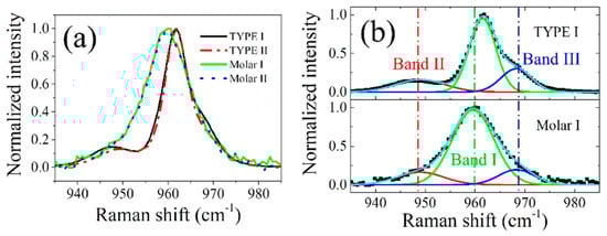 Figure 3a compares the normalized Raman spectra collected on the untreated HAp ceramics and tooth samples in the spectral range from 935 to 985 cm−1. All observed bands arose from the P-O stretching v1 mode in PO4 tetrahedra of HAp, and spectral deconvolution of the representative spectra (Figure 3b) revealed the presence of three sub-bands, located at around 947, 961, and 969 cm−1. These bands correspond to the amorphous phase (band II), crystalline structure (band I), and HPO4 group defect (band III) in HAp, respectively [,,]. Note that the two kinds of ceramics (TYPE I and II) have slightly different intensities (sub-band area) for bands II & III in the normalized spectra (higher values for TYPE I), but each sample exhibited a negligible change in the Raman spectral morphology at different locations within the sample (cf. Figure S2 in the supplementary material of Ref. []), indicating a compositional homogeneity throughout the sample.