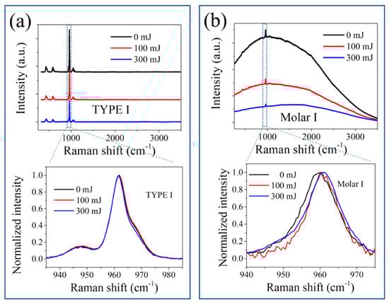 Variations of Raman spectra for (a) HAp ceramics and (b) tooth samples subjected to laser irradiation at 0, 100, and 300 mJ, with an enlargement in the range from 940 to 985 cm−1 after baseline subtraction.