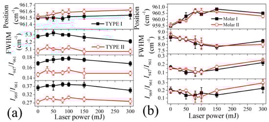 In contrast, the tooth samples exhibited a peak shift of band I to higher wavenumbers as the laser power increased, but then a decrease at higher laser powers, while FWHM showed a trend of initially decreasing and then increasing at higher powers (Figure 5b). The two intensity ratios also showed a similar trend of variation to that of FWHM, i.e., an initial decrease as laser power reached 100 mJ, and then an increase at higher powers.