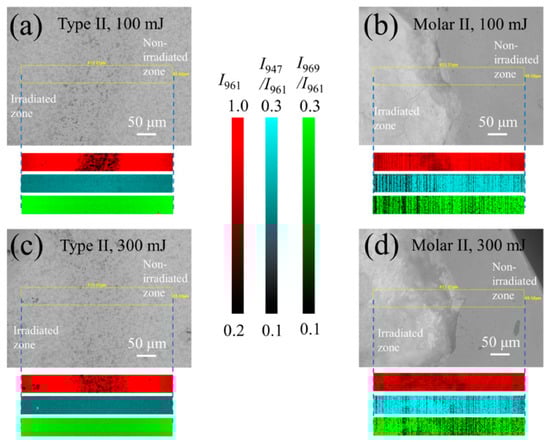As can be seen in Figure 6, for the HAp ceramic, despite an observed decrease of I961 at the boundary due to the presence of the introduced mark (also cf. inset to Figure 2a), the two intensity ratios showed an indiscernible variation within the irradiated zone. This is because the lower spectral resolution of this machine for imaging is incapable of revealing the slight variations of these values shown in Figure 5a. In contrast, for the tooth samples, the irradiated zones could be clearly observed from the microscope and showed distinct variations from the non-irradiated zone. The intensity ratios of I947/I961 and I969/I961 showed a decrease (i.e., darker in contrast) in the zone irradiated with a laser power of 100 mJ, while these values increased at 300 mJ. Despite a lower spectral resolution, the observations made by Raman imaging are consistent with the results given in Figure 5b.