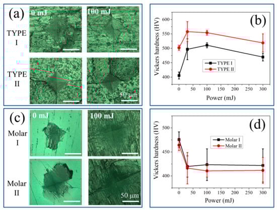The Vickers indentation method was then applied to investigate the influence of laser irradiation on material hardness. Figure 7a,c show representative micrographs of the prints generated on the two types of samples with and without laser irradiation using a power of 100 mJ. All indentation prints exhibited similar square-like profiles for the investigated samples. Unlike the ceramic sample, the tooth samples did not exhibit any crack generation around the prints. As shown in Figure 7b,d, according to the variation of the mean diagonal length of the print in response to the laser power, the values of the Vickers hardness and HV could be calculated at different laser powers for HAp ceramics and tooth samples, respectively.