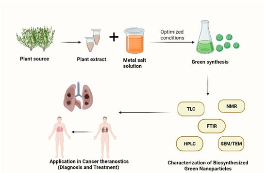 Plant-mediated process for biosynthesis of nanoparticles: optimization, characterization, and potential application in cancer theranostics. (Created with BioRender.com).