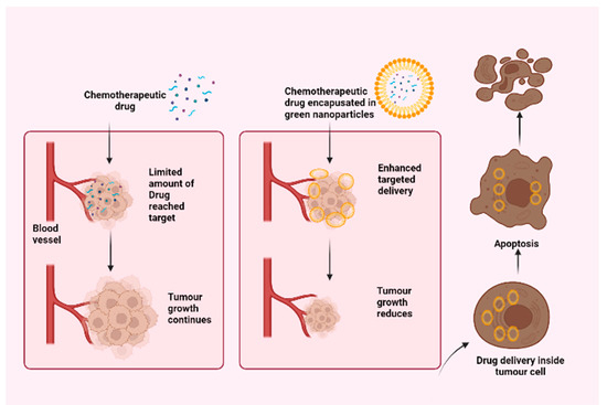The nanotech-based combinations of drugs formulated from nature-derived molecules have enormous potential for targeting tumor microenvironments in order to combat multidrug resistance (multidrug resistant) as these nanotech-based delivery systems have several advantages similar to water solubility, lower toxicity, biocompatibility, and the ability to modify their surface for further applications [76]. Drug delivery systems that are engineered at the nanoscale have been extensively studied and are by far the most advanced technology in the field of nanoparticle applications due to their potential advantages, such as the ability to modify physical properties such as solubility, release profiles, diffusion, bioavailability, and immunogenicity [77,78]. The delivery of engineering drug systems either targets a specific site or injects therapeutic agents into the site in a controlled manner [79]. Figure 2 shows the efficacy of a chemotherapeutic drug when it is encapsulated in green nanoparticles.