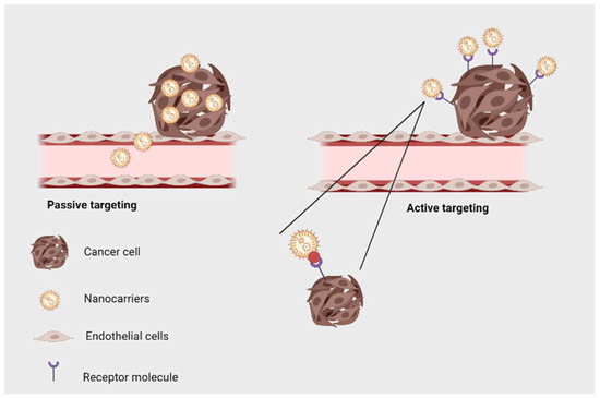 In the drug delivery of natural phytochemicals, nanoparticles, and nanocarriers can target specific tissues or organs. This feature offers several benefits. Various targeting strategies of natural compounds can be achieved with nanoparticles. The first type of targeting involves attaching a therapeutic ligand to the surface of a nanoparticle, enhancing drug bioavailability by increasing doses that reach target tissues. Active targeting usually involves conjugating nanoparticles with proteins, peptides, antibodies, or small molecules. This enables specific tissues and organs to internalize and localize the particles. Passive targeting, on the other hand, is the delivery of drugs to a specific area of the body without the use of certain chemical interactions, but rather by relying on the intrinsic properties of the particles, such as size, shape, and surface charge. Because the drug is only being released to that specific area, the aftereffects of the drug are also reduced [88,89]. Figure 3 shows active and passive targeting of tumor cells using nanoparticles.