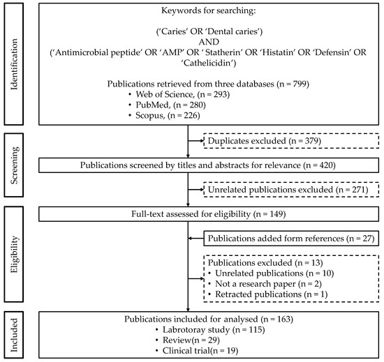 The initial literature search revealed 799 publications (Figure 1) from Web of Science (n = 293), PubMed (n = 280) and Scopus (n = 226). Duplicate publications (n = 379) were removed, so that the remaining number was n = 420. After screening the title and abstracts, 271 publications unrelated to caries and/or antimicrobial peptides were excluded.