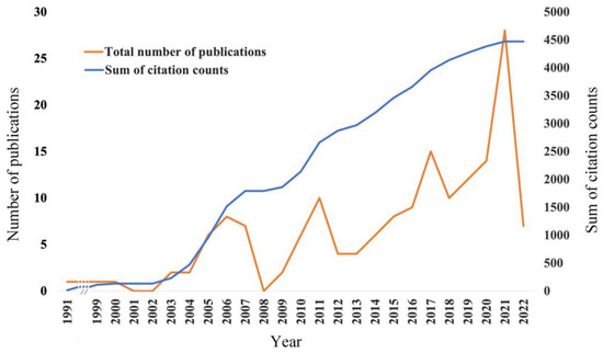 The full record of included publications was obtained from Web of Science, PubMed and Scopus. All the data were locally preserved. The R package program Biblioshiny (https://www.bibliometrix.org, accessed on 1 August 2022) was used to extract and analyse the bibliometric data [11]. Keywords, publication type, citation count, citation density (the average number of citations per year: citation count/(2022-published year)), publication number by year, journal of publication (type of publication, research theme and research focus) and authorship (authors’ countries and institutions) were extracted, analysed and visualised.