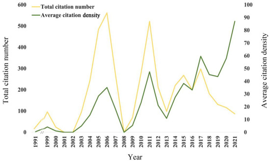 The citation count per year and citation density per year on antimicrobial peptides for caries management from 1991 to 2022.