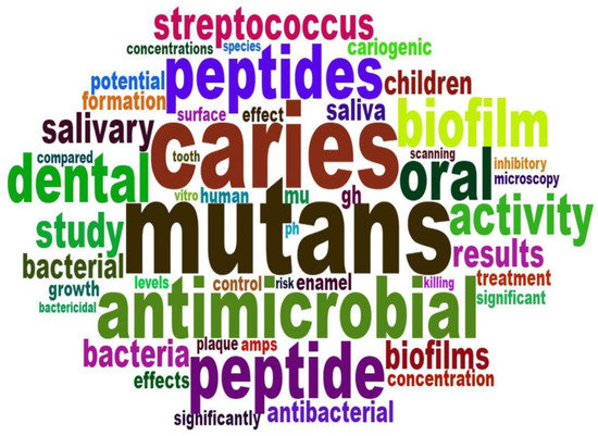 Among the other top five high-citation publications, three were laboratory studies and one was a review. Ouhara et al. investigated the antimicrobial properties against oral pathogens of another natural antimicrobial peptide, LL37 [29]. Wei et al. developed a series of antimicrobial peptides derived from mucins and tested their antimicrobial properties against oral pathogens [30]. Eckert et al. developed a novel specially targeted antimicrobial peptide, C16G2, against S. mutans [31]. This peptide was the only novel antimicrobial peptide processed for clinical trials [42]. In 2011, Batoni et al. reviewed antimicrobial peptides’ possible advantages and limits for their use against microbial biofilm-related infections [32].