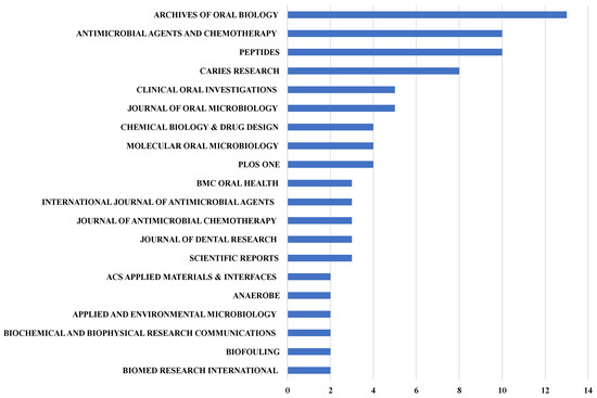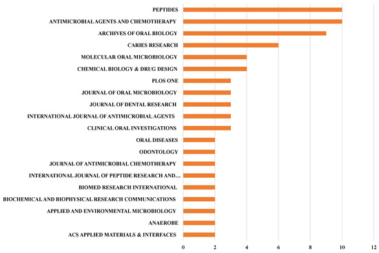Twenty journals reporting antimicrobial peptides for caries management according to the number of publications.