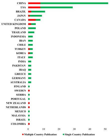 China (n = 52) and the US (n = 29) contributed almost half of the included publications (81/163, 49%). In addition, global collaborations for research on antimicrobial peptides for caries management were common in China (MCP/SCP = 8/44). Other counties such as the US (MCP/SCP = 8/29) and Canada (MCP/SCP = 8/29) were also involved in international collaborations (Figure 7).
