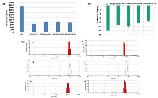 Particle size and net surface charge are the two vital factors for determining the fate of NPs both in vitro and in vivo. The rate of biodistribution, tumour accumulation, and clearance of NPs may widely vary with particle size and surface charge [,,]. As analyzed by the DLS method, the size of the SSNs prepared by mixing 40 mM of SrCl2 and 10 mM of Na2SO3 without PEG showed a mean particle size of 2096.33 nm and a zeta potential of −11.95 mV (Figure 2A,B). On the other hand, PEGylated SSNs’ average diameter showed a significant decreasing pattern at different biotin-PEG concentrations. The sizes of PEG-SSNs synthesized at varying concentrations of biotin-PEG (20–300 nM) ranged from 689 to 832 nm while the zeta potential varied from −9.345 to −7.25 mV, indicating the successful adsorption of the PEG moiety on the surface of SSNs.