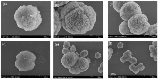 FE-SEM images of SSNs and PEG-SSNs. SSNs were prepared by mixing 40 mM of SrCl2 and 10 mM of Na2SO3 in 50 µL of aqueous solution and PEG-SSNs were synthesized by adding 20 nM of biotin-PEG to SSNs. Images denoted by (a–c) represent unmodified SSNs, while those indicated by (d–f) represent PEGylated SSNs. All images were observed at 5.0 KV.