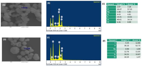 Elemental analysis of SSNs and PEG-SSNs by EDX. SSNs were prepared by mixing 40 mM of SrCl2 and 10 mM of Na2SO3 in 50 µL of an aqueous solution, while PEG-SSNs were synthesized by adding 20 nM biotin-PEG to the SSNs. (A,B) EDX spectrum of SSNs; (C) weight and atomic percentage of SSNs; (D,E) EDX spectrum of PEG-SSNs and (F) weight and atomic percentage of PEG-SSNs.