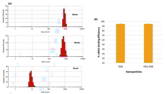 The stability of PEG-SSNs in blood was determined by measuring particle size distributions in medium, water, and mice plasma. As shown in Figure 5A PEGylated SSNs in DMEM and deionized water displayed the same particle size distribution pattern with a PDI value of 0.659. On the other hand, in mice blood, the particles were found in a much smaller size, which might be due to the coating of blood proteins on the surface of PEG-SSNs. Moreover, the affinity of negatively charged siRNA towards the NPs is one of the major determinants for the successful delivery of the siRNA into the target cancer cells, preventing its early release in extracellular fluid including the blood, and consequential premature degradation by nucleases. Both SSNs and PEGylated SSNs were complexed with 10 nm of AF-488 fluorescence siRNA and centrifuged to sediment siRNA-loaded NPs and estimate the unbound, free siRNA in the supernatant. As shown in Figure 5B both SSNs and biotin-PEG-coated SSNs showed siRNA binding efficiency of more than 90%, indicat ing that PEG coating didn’t interfere with the siRNA binding.