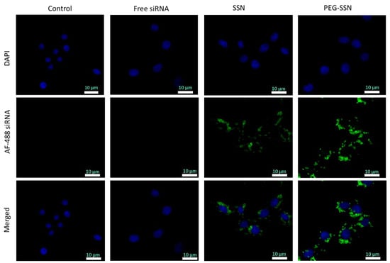 Cellular uptake of free AF-488 fluorescent siRNA, SSNs, and PEG-SSNs with loaded fluorescent siRNA in MCF-7 cells. SSNs were prepared by mixing 40 mM of SrCl2 and 10 mM of Na2SO3 in 50 µL of an aqueous solution while PEG-SSNs were synthesized by adding 20 nM biotin-PEG to the pre-formed SSNs. CSLM images were taken after 1 h incubation of the treated cells. AF-488 fluorescence siRNA was represented by green color while the nuclear staining DAPI by blue color.