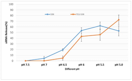 The performance of nanoformulations to carry siRNAs relies on the efficient release of siRNA in the target cell cytoplasm to silence the target gene expression after cellular internalization. It is assumed that quick releases of siRNAs from endocytosed nanocomplexes at an early endosomal stage would exert rapid pharmacological effect and bypass the lysosomal degradation. Figure 7 represents the SSNs and PEG-SSNs/siRNAs complex’s release profile at different pHs starting from physiological pH to acidic pH. The release of fluorescence siRNA from SSNs and PEG-SSNs was increased by more than 60% as the pH dropped from 7.5 to 5.0. At pH 5.0 the PEG-SSNs showed a higher release of siRNAs than unmodified SSNs. This was probably due to the instability or dissociation of PEG-SSNs at acidic pH, releasing more siRNAs.