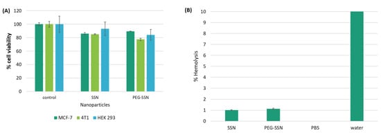 The non-toxic nature of NPs is another vital factor for the successful delivery of siRNA in a clinical setting. A standard MTT colorimetric assay was carried out to evaluate the potential cytotoxicity of SSNs and PEG-SSNs in breast cancer cells MCF-7, 4T1, and healthy human embryonic kidney cells, HEK 293. Figure 8A demonstrated that SSNs with or without PEG showed no significant hampering of cell activity and that cell viability was maintained close to 80%, following exposure of the cells to the formulations for a consecutive period of 48 h, compared to the untreated cells. To further understand the biocompatibility of PEG-SSNs, a hemolytic assay was performed by measuring the level of hemoglobin released due to the rupture of the erythrocytes (RBCs) after treatment with the NPs. As shown in Figure 8B, no noticeable hemolysis was found for SSNs and PEG-SSNs compared to the control group.