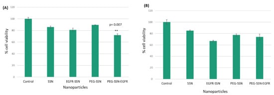 Cytotoxicity assay of SSNs and PEG-SSNs with loaded EGFR siRNA (denoted here as ‘EGFR’) in MCF-7 (A) and 4T1 (B) cells. SSNs were prepared by mixing 40 mM of SrCl2 and 10 mM of Na2SO3 in the absence or presence of 1 nM siRNA in 50 µL of an aqueous solution, while PEG-SSNs were synthesized by adding 20 nM biotin-PEG to the SSNs previously formed in absence or presence of the same dose of the siRNA. Cell viability was assessed after treatment of MCF-7 (A) and 4T1 cells (B) with SSNs, SSNs-EGFR, PEG-SSNs, and PEG-SSN-EGFR for a consecutive period of 48 h. Values were considered very significant (**) at p-value 0.001 to 0.01 and significant (*) at p-value 0.01 to 0.05 compared to SSNs and PEG-SSNs.