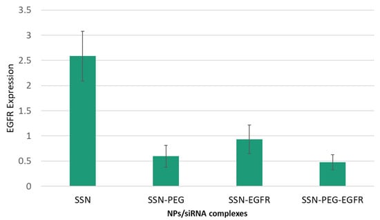 EGFR and its activated signaling cascades have notable roles in developing and progressing human breast cancers. Overexpression of EGFR was reported in breast cancer including TNBC (triple-negative breast cancer) and other types of breast cancer [,,,,,,]. We hypothesized that the silencing of EGFR expression using a specific siRNA might reduce [] the proliferation and growth of breast cancer cells and be beneficial for exerting antitumour activity. To investigate the in vitro anticancer efficacy, SSNs and PEG-SSNs coupled with EGFR siRNA were incubated separately with MCF-7 and 4T1 cells with a view toward silencing the overexpressed EGFR; the cell viability was measured by MTT assay. It was found that treatment of MCF-7 and 4T1 with SSNs with loaded anti-EGFR siRNA for 48 h resulted in enhanced cytotoxicity of 17% and 4%, respectively (Figure 9). PEG-functionalized SSNs also showed a higher growth inhibitory effect in both cell lines than the empty NPs. These data indicate that both SSNs and PEG-SSNs efficiently carried the siRNA into the breast tumour cells and inhibited tumour cell growth by silencing EGFR gene expression.