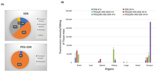 We previously reported the fabrication of pH-responsive strontium sulfite nanoparticles (SSNs) and the application of the nanocarrier to efficaciously transport ROS1 siRNA into tumour cells, demonstrating a significant reduction in tumour volume in a murine breast cancer model []. To make the system more effective for systemic administration, we modified the surface of SSNs with biotin-PEG for improving their blood circulation time, minimizing off-target distribution, and augmenting tumour accumulation. The association of biotin-PEG with NPs resulted in the reduction of the hybrid particle size by inhibiting particle aggregation. The size, morphology, elemental analysis, and stability study of PEG-SSNs supported our original assumption that the small-sized PEG-SSNs could protect the siRNA from biological instability and increase the accumulation in the intended tumour site via the EPR effect. We also examined the binding affinity of PEG-SSNs to siRNA and their capability to carry siRNA into the tumour cell and silence the overexpressed EGFR gene with anti-EGFR siRNA in human and murine breast cancer cell lines. Next, the quantification of the proteins entrapped onto the surface of SSNs and PEG-SSNs was analyzed using triple quadrupole liquid chromatography-mass spectroscopy (QQQ LC/MS) and attempted to correlate with the time-dependent distribution patterns of intravenously administered fluorescence siRNA-loaded SSNs and PEG-SSNs in major organs and tumours. Finally, the tumour regression capacity of SSNs and PEG-SSNs with loaded anti-EGFR siRNA and the safety profile of the formulations were evaluated in the same breast tumour-bearing mouse model.