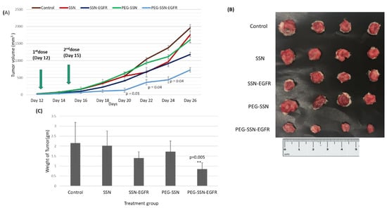 After the tumour reached an average volume of ~22 mm3 at around day 10–11 of subcutaneous injection, tumour-bearing mice were injected with free SSNs, free PEG-SSNs, EGFR-SSNs (50 nM of EGFR siRNA), and EGFR-PEG-SSNs (50 nM of EGFR siRNA) intravenously (tail-vein) at the right or left caudal vein. Three days following the first treatment, the second dose was given. Four mice were in each treatment group. Over the course of 26 days, measurements of the tumour’s length and width were taken using the Vernier calliper at regular intervals. The tumour volumes of each group of mice were shown as mean SEM in the data. The following formula was used to calculate the tumour volume (mm3):