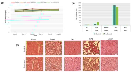 The blood was collected from the mice treated with PEG-SSNs-EGFR and without any treatment (control) on day 26 for biochemical analysis to calculate the levels of alkaline phosphatase (ALP), aspirate aminotransferase (AST), alanine aminotransferase (ALT), amylase (Amy), and creatinine (Cr) in serum samples of the mice. For histopathology analysis, collected major organs including heart, liver, spleen, kidney, and lung from both control and treatment groups were fixed at day 26. The fixed organs were then processed for hematoxylin and eosin (H and E) staining and images were taken for analysis.